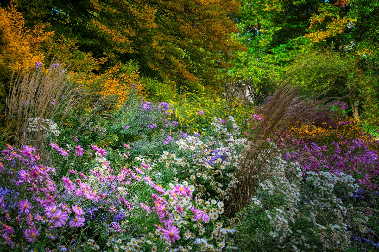 1) Planting a minimum of three species that bloom simultaneously during a specific season or time of year can make the entire garden appear far more abundant in flowers than it actually is.