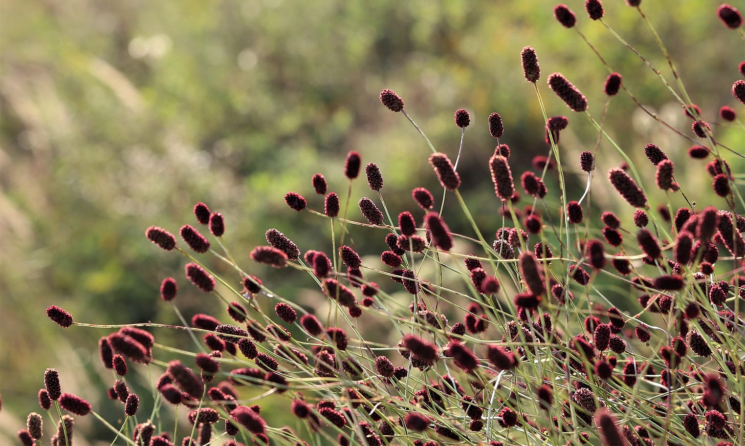 Completing the selection are Salvia nemorosa (woodland sage), chosen for its light, upright habit and beautiful inflorescences, and Sanguisorba officinalis (great burnet). I've included these last two perennials not because they're meant to mimic anything specific, but because they serve as a “pleasant extra”, a splash of colour that catches the eye amidst the vegetation. I could say I included Sanguisorba officinalis because, among the myriad of grasses, its oblong inflorescences might vaguely resemble those of Typha, the emblematic cattail that grows along rivers... But that wouldn't be true.